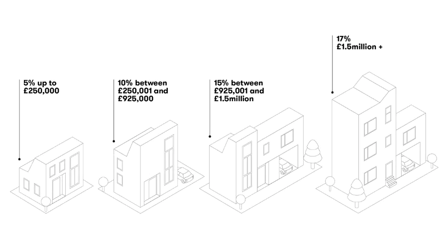 That means you will now pay 5% on homes purchased up to the value of £250,000; 10% on the portion of the purchase price between £250,001 and £925,000; and 15% on the portion between £925,001 and £1.5million. Above £1.5million, Stamp Duty will be charged at a rate of 17% of the purchase price.