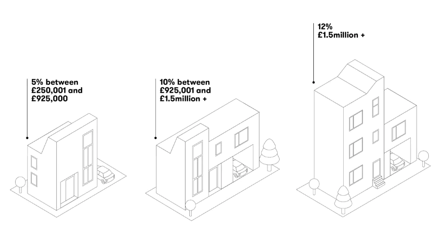 A rate of 5% will then apply to the portion of the purchase price between £250,001 and £925,000; 10% on the portion between £925,001 to £1.5million; and 12% on the remaining balance above £1.5million.