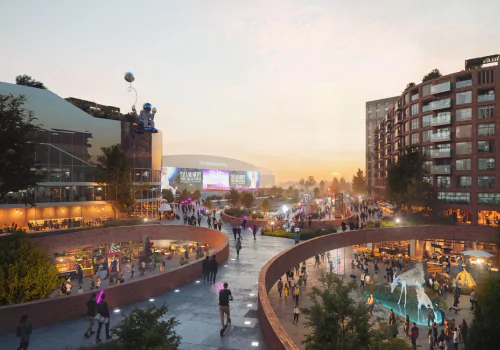CGI rendering of a bustling park at dusk with a large lake and busy waterfront boardwalk. YTL Arena and high-rise buildings are in the background.