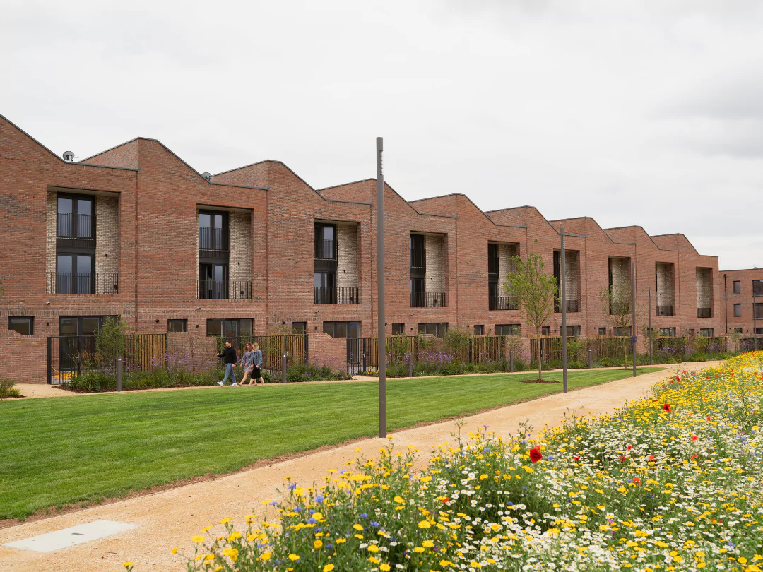 Modern brick terrace house, with A-frame roofline at Brabazon, Bristol.