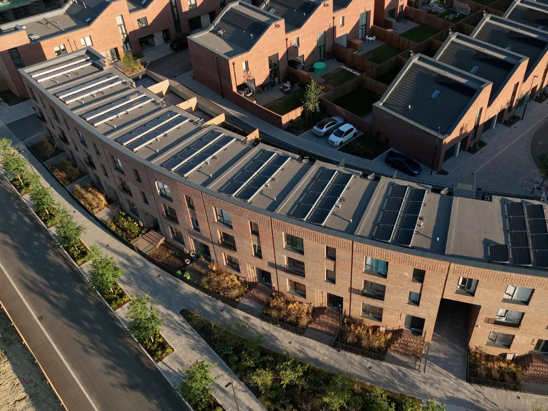 Aerial view of sustainable, red brick townhouses at Brabazon, showcasing  complete with PV solar panels on every home, tree-lined streets and wide cycle and walkways.